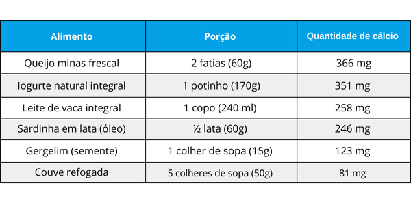 Confira abaixo alguns dos alimentos fontes de cálcio e a quantidade do mineral por porção6.