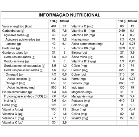 Lactose, leite em pó desnatado, maltodextrina, óleo de milho, concentrado proteico de soro de leite, óleo de canola, soro de leite em pó, frutooligossacarídeos, óleo de girassol, inulina, carbonato de cálcio (cálcio), sulfato de magnésio (magnésio), bitartarato de colina (colina), fosfato de potássio dibásico (fósforo), L-ascorbato de sódio (vitamina C), acetato de DL-alfa-tocoferila (vitamina E), fumarato ferroso (ferro), sulfato de zinco (zinco), nicotinamida (niacina), DL-alfa-tocoferol (vitamina E), D-pantotenato de cálcio (ácido pantotênico), acetato de retinila (vitamina A), colecalciferol (vitamina D), sulfato de manganês (manganês), D-biotina, filoquinona (vitamina K), sulfato cúprico (cobre), tiamina mononitrato (vitamina B1), riboflavina (vitamina B2), cloridrato de piridoxina (vitamina B6), iodeto de potássio (iodo), selenito de sódio (selênio), ácido N-pteroil-L-glutâmico (ácido fólico), cianocobalamina (vitamina B12), regulador de acidez citrato de potássio, aromatizante e emulsificante mono e diglicerídeos de ácidos graxos.