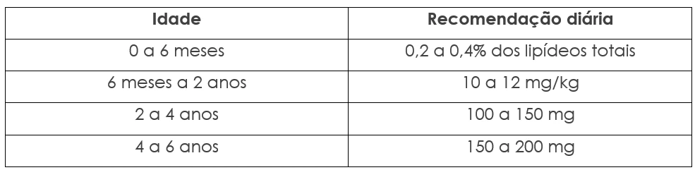 Veja a seguir a recomendação atual de consumo de DHA para crianças na primeira infância8: