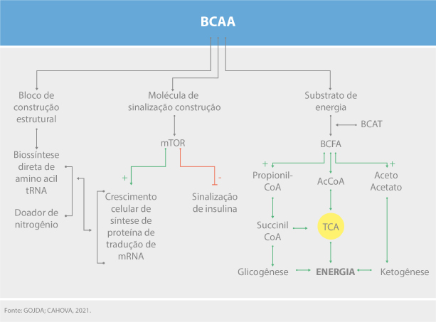 As concentrações de BCAA na circulação sistêmica refletem a dose administrada ou reabsorvida. Além disso, a leucina é um dos aminoácidos mais abundantes nas proteínas corporais. Eles também atuam como sinais de detecção de nutrientes para muitos tecidos-alvo. ¹
