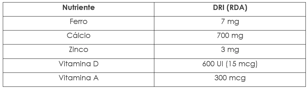 Confira abaixo a recomendação de cada nutriente para crianças de 1 a 3 anos de idade (DRI):